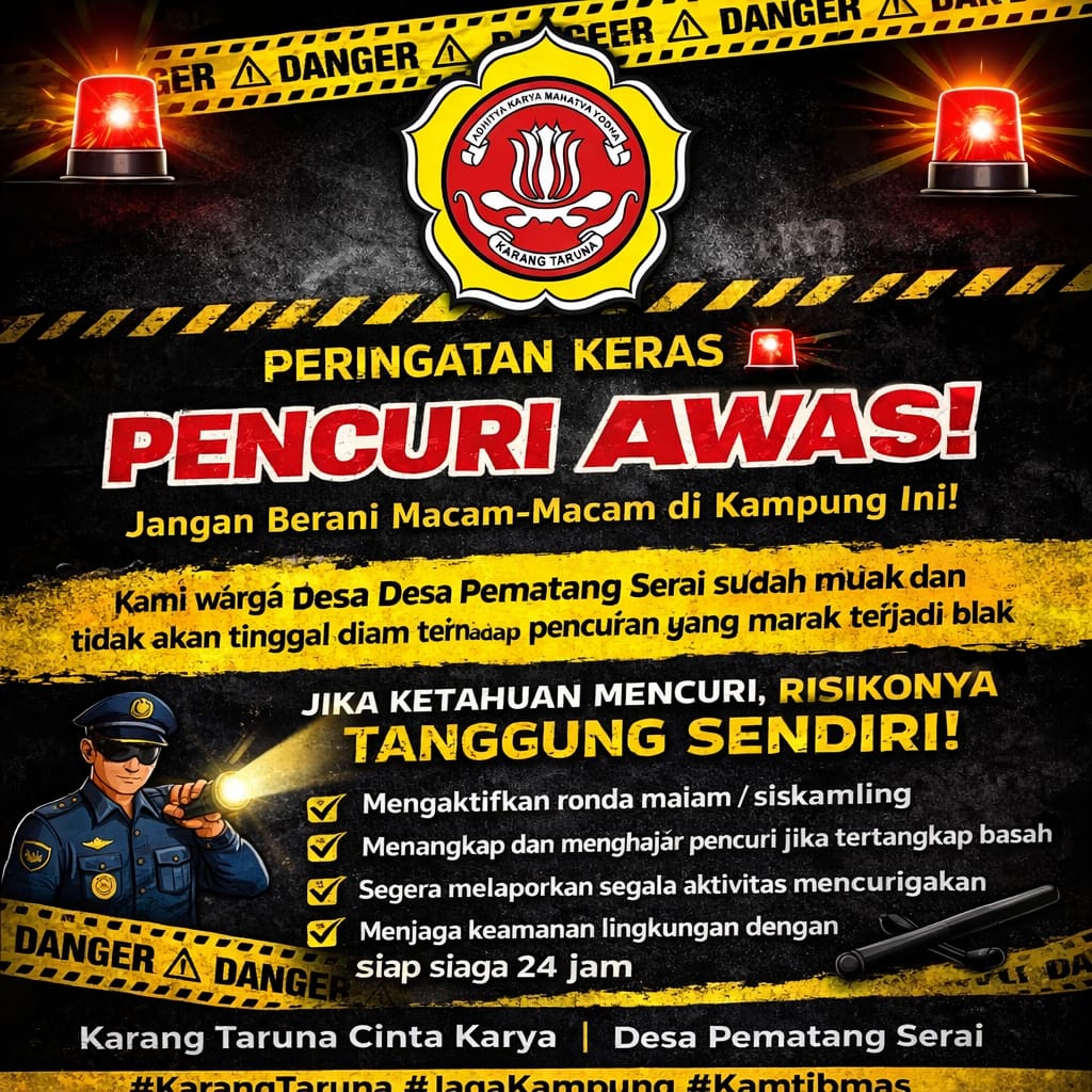 Newsnarasi.com , Langkat — Maraknya aksi pencurian yang terjadi di Desa Pematang Serai dalam beberapa waktu terakhir memicu keresahan di tengah masyarakat. Menyikapi kondisi tersebut, Karang taruna Cinta Karya Desa Pematang Serai menyampaikan pernyataan sikap tegas terkait situasi keamanan dan ketertiban masyarakat (kamtibmas) di wilayah tersebut. Minggu (08/03/26)